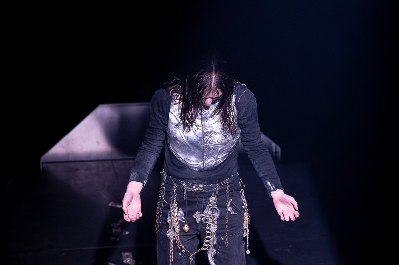 L’interprète est accompagnée d’un ensemble d’objets métalliques portables, à la fois charges et extensions du corps. Ceux–ci génèrent un autel sonore et vocal qui dévoile peu à peu un geste surexposé de conquête de liberté et de résilience dans le chaos.